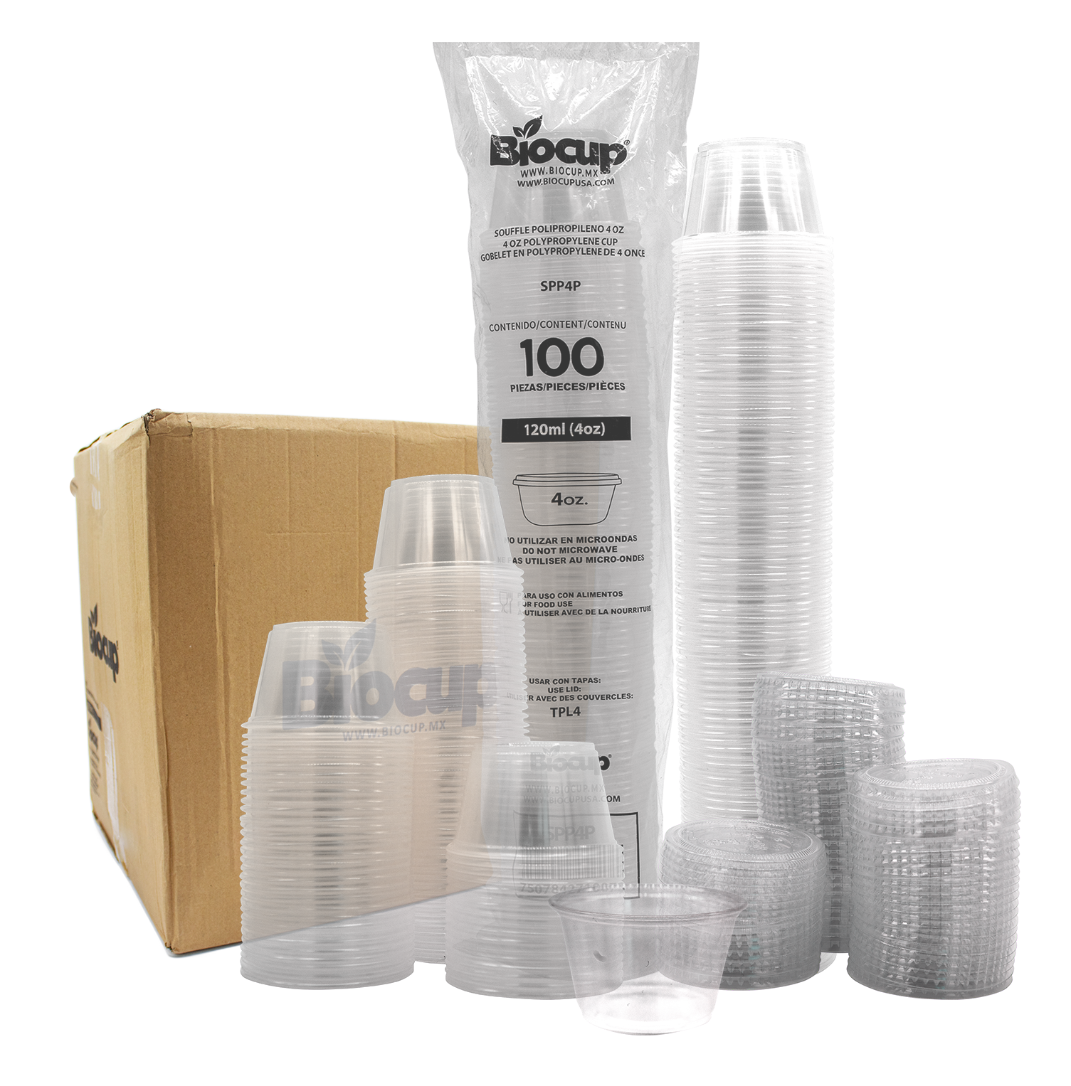 Optimiza la presentación de tus porciones individuales con los vasos Soufflé Biocup de 4 oz con tapa. Fabricados en polipropileno (PP) transparente, son resistentes, reciclables y permiten ver el contenido con claridad, lo que los hace ideales para todo tipo de entorno, desde cocinas industriales hasta eventos sociales.