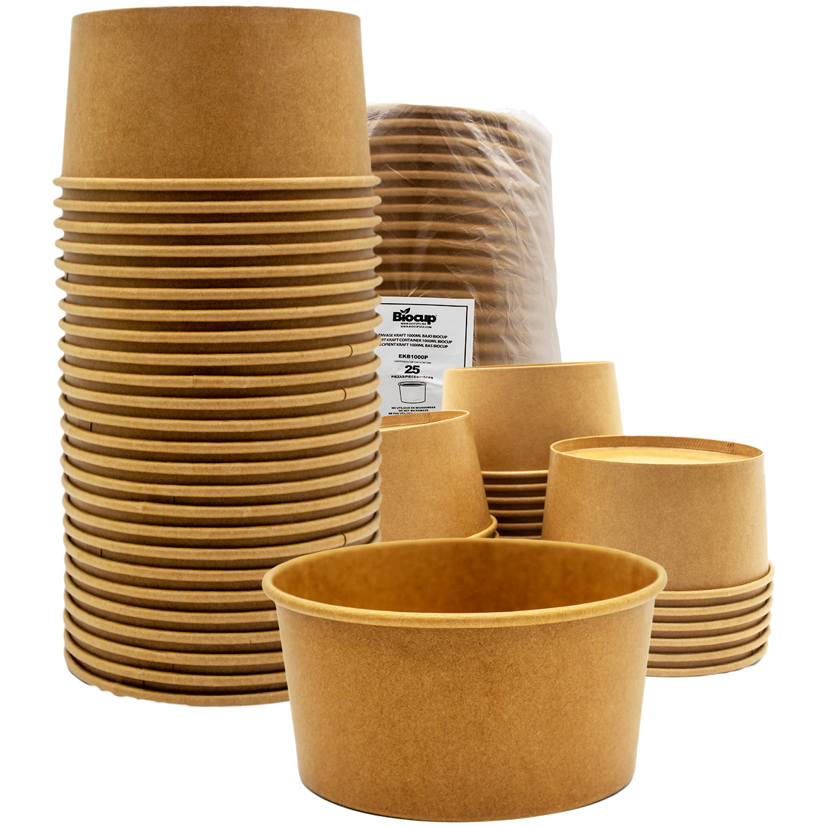 Lleva tus porciones más abundantes a otro nivel con los envases Kraft Biocup de 1000 ml. Este paquete de 25 piezas sin tapa está diseñado para conservar y transportar alimentos fríos, tibios o calientes con total confianza.