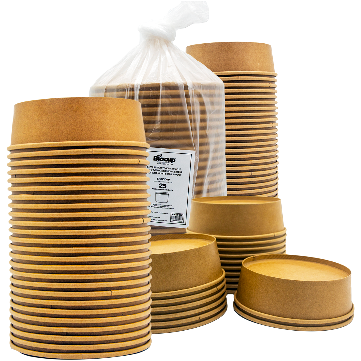 Lleva tus porciones más abundantes a otro nivel con los envases Kraft Biocup de 500 ml. Este paquete de 25 piezas sin tapa está diseñado para conservar y transportar alimentos fríos, tibios o calientes con total confianza.