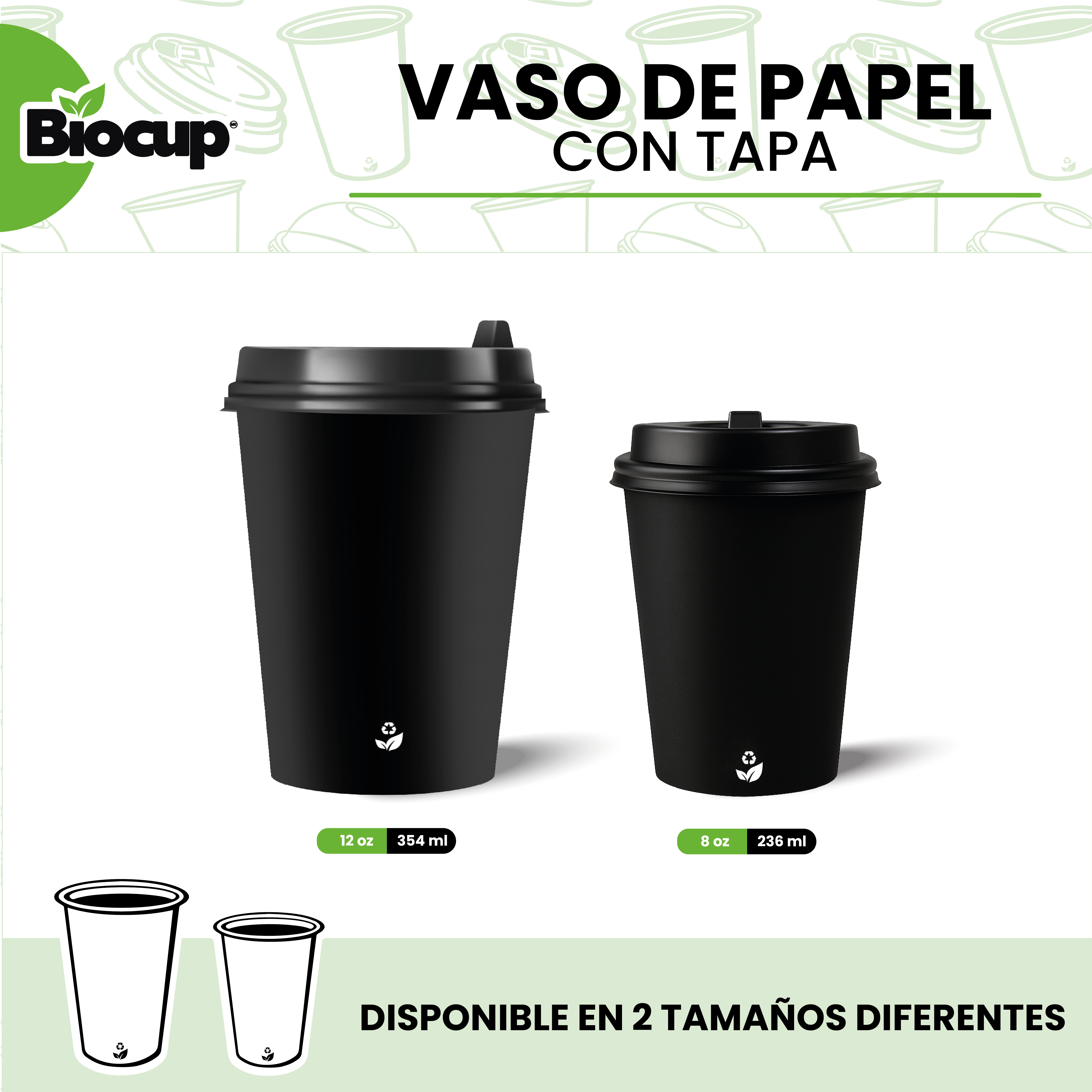 El Paquete Vasos de Papel Biocup color negro con Tapa ofrece una solución premium para servir bebidas con estilo y comodidad.